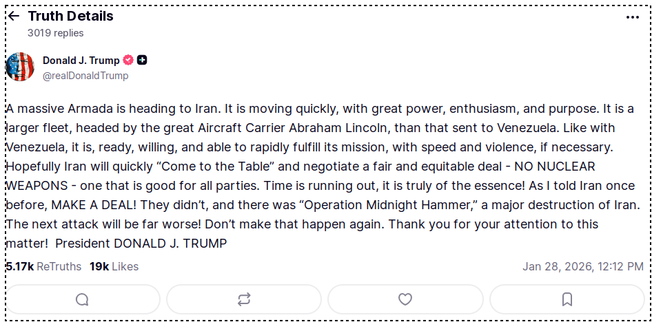 Trump says an Armada larger than that sent to Venezuela is heading to Iran.